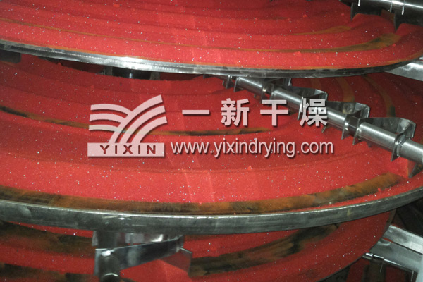 紅礬鉀連續地加到干燥器上部第一層干燥盤上,帶有耙葉的耙臂做回轉運動使耙葉連續的翻抄物料,使 紅礬鉀充分吸收熱量, 紅礬鉀沿指數螺旋線流過干燥盤表面,在小干燥盤上的物料被移送到外緣,并在外緣落到下方的大干燥盤的外緣,在大干燥盤上的 紅礬鉀向里移動并從中間落料口落入下層小干燥盤中,大小干燥盤上下交替排列, 紅礬鉀得以連續的流過整個干燥器,中空的干燥盤內通入加熱介質。加熱介質由干燥盤的一端分為兩組進入干燥盤面,使 紅礬鉀受熱更加均勻,從另一端導出。底部兩層盤面及底部出料盤加水冷卻裝置,干燥冷卻后的物料從殼體底層被耙葉移送到出料口排出,并經螺旋輸送器出料、包裝。水份從 紅礬鉀中蒸發汽化后逸出,進入布袋除塵器,由引風機^后排出。